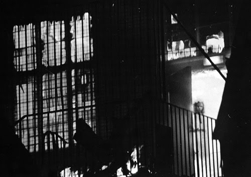 In the developed black and white photo, a young girl is standing behind a railing, inside the burning building. A loose, slightly old-fashioned white dress falls to her knees. She gazes out into the night with an unreadable expression, seeming to stare directly at the camera.