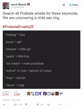 Meanwhile, the online Sherlocks conclude that some of Washington’s most prominent citizens could walk into  certain establishments and simply “order” young children off the menu for sex, using the code words. Why else would people email so incessantly about food? The first food-related reference to gain a lot of attention was the sentence “I’m dreaming about your hotdog stand in Hawaii…”, but the narrative quickly centres around pizza. The investigators begin using the hashtag #pizzagate on social media.