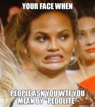 Early 2018: Pizzagaters mob up on model/TV show host Christine Teigen, analyzing her social media accounts for incriminating child-molesting stuff. Apparently, this began when Teigen posted photos of her 1-year-old daughter’s 2017 Halloween costumes: Alice in Wonderland and a hot dog. Then she tweeted something about “pedolite” not tasting very good. This was clearly a reference to the infant hydration formula Pedialyte, designed for sick infants, which is a widely-known hangover remedy.