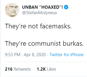 He was forced to pull the toothpaste and related products from the Infowars Store, so he is now aggressively pushing his emergency foodstuffs and supplements. - He likens facemasks to the burqa. This sentiment has been expressed in an identical way by Stefan Molyneux and other conspiranoid/right lite online personalities. He says facemasks are designed to make us feel ashamed of our humanity.